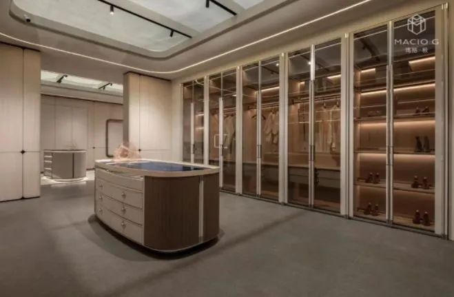 A8空間帶來(lái)了“隱奢生活”,包括廚房空間、客廳電視柜與衣帽間。其中國(guó)潮衣帽間,產(chǎn)品中的背景墻將木皮與彩貝相拼接,將現(xiàn)代設(shè)計(jì)與傳統(tǒng)手工藝做了融合。而這種將東西方屬性融合的方式,也讓人們開(kāi)始真正反思什么才是屬于當(dāng)代國(guó)人的高定生活。