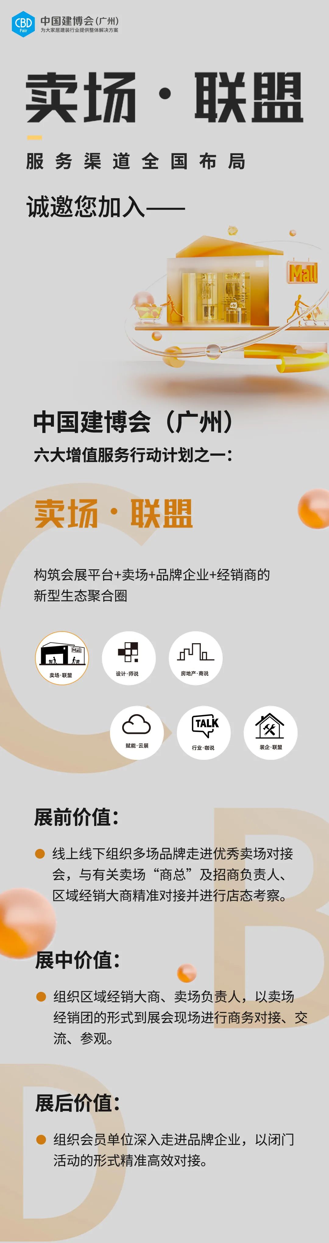 作為大家居建裝行業(yè)全球第一展,中國建博會(huì)(廣州)針對(duì)參展企業(yè)的選商、育商、優(yōu)商需求,協(xié)同全國多家連鎖賣場和區(qū)域優(yōu)秀賣場,精選當(dāng)?shù)卮笊,?lián)合九正建材網(wǎng)重磅推出“賣場·聯(lián)盟”增值服務(wù),聚焦經(jīng)銷商和加盟商渠道,以賣場為發(fā)力點(diǎn),構(gòu)筑“會(huì)展平臺(tái)+賣場+品牌企業(yè)+經(jīng)銷商”的新型生態(tài)聚合圈,助力參展企業(yè)、賣場、經(jīng)銷商之間實(shí)現(xiàn)高效對(duì)接,共謀發(fā)展。