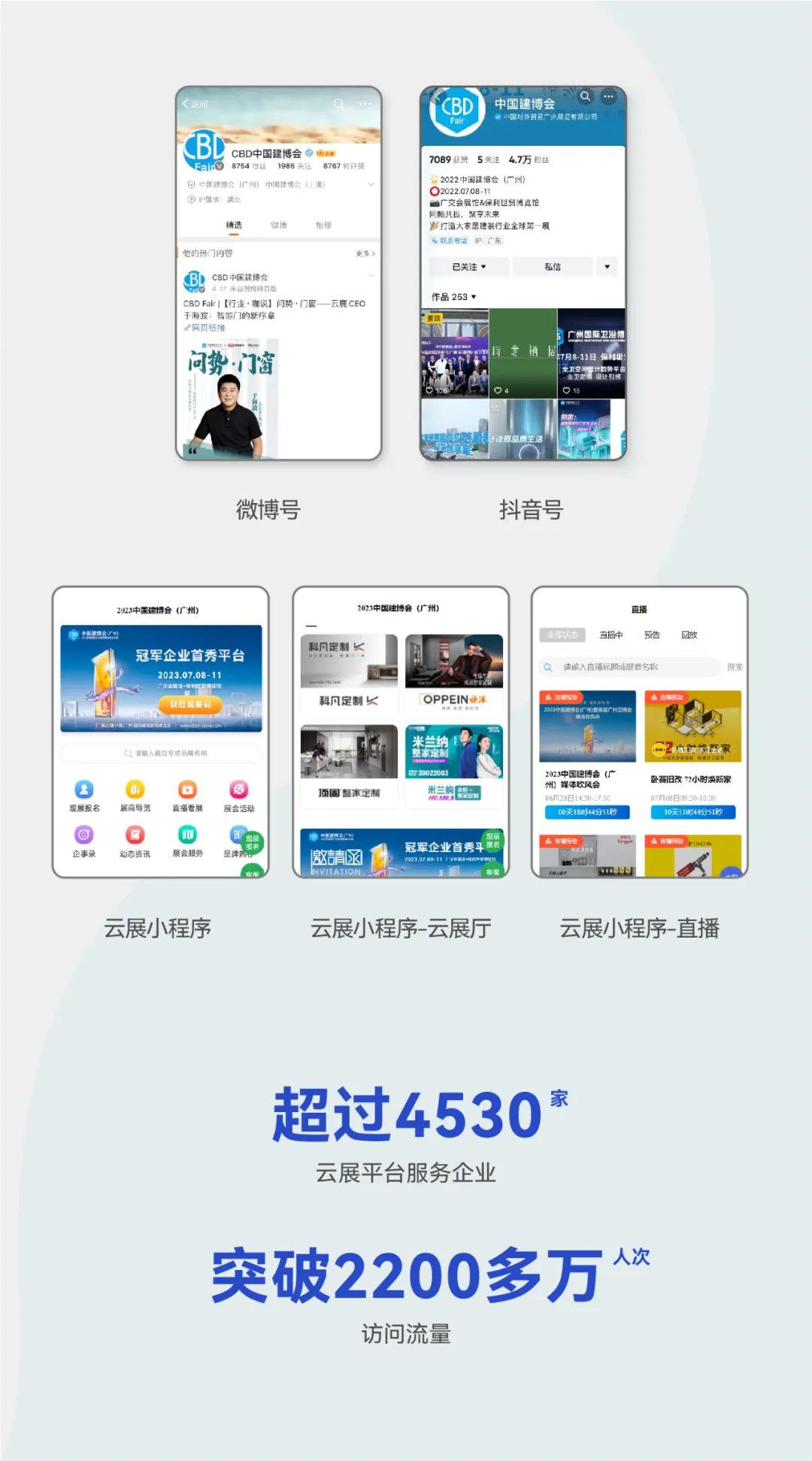 中國建博會(廣州)始終以創(chuàng)新驅(qū)動(dòng)變革,堅(jiān)持賦能企業(yè)與行業(yè)發(fā)展。自2020年起,中國建博會(廣州)創(chuàng)新開拓了線上線下融合的發(fā)展路徑,打造“賦能·云展”平臺,連續(xù)三年突破服務(wù)邊界,成功為參展商開辟了線上營銷的全新服務(wù)!百x能·云展”平臺以建博會官方小程序?yàn)橐I(lǐng),綜合規(guī)劃和協(xié)同建博會官網(wǎng)、微信公眾號、視頻號、云展廳、線上直播等渠道,協(xié)同鋪設(shè)小紅書、企業(yè)微信、新浪微博、抖音號、頭條號、網(wǎng)易號、百家號、搜狐號等新媒體渠道,升級打造云展會、云直播、云洽談和云對接等服務(wù)。