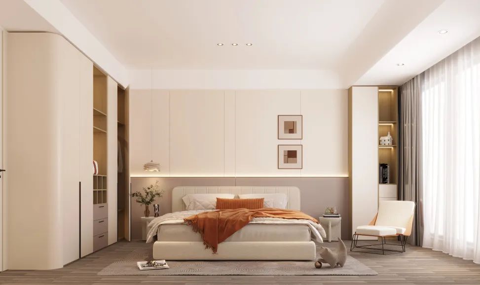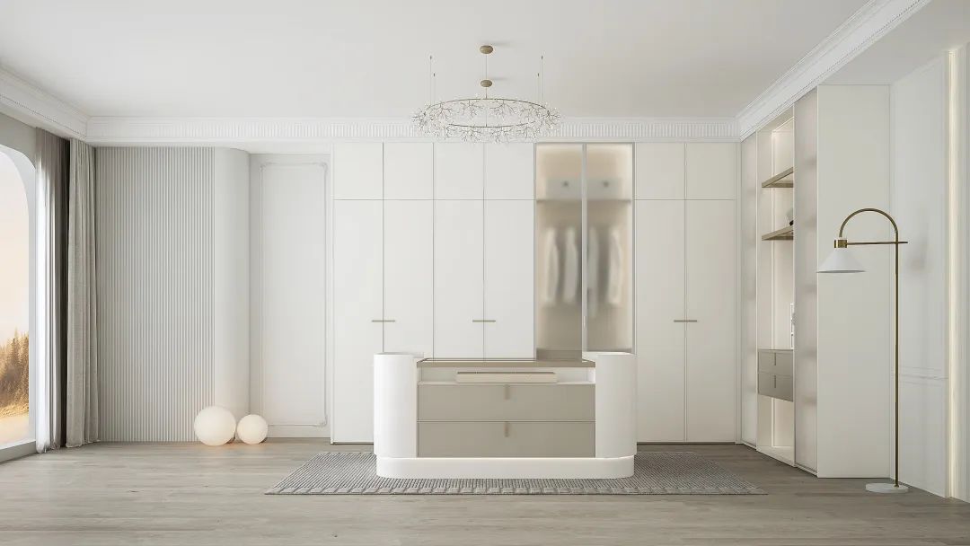 U型衣帽間設(shè)計(jì),給予空間更多組合可能性,通過(guò)材質(zhì)與色彩的穿插,傳遞出穩(wěn)重的氣氛與精致的格調(diào),嵌入式拉手抽面去除過(guò)多的繁雜的雕飾,賦予簡(jiǎn)潔、流暢的線條與柜板融合為一體,美觀時(shí)尚。