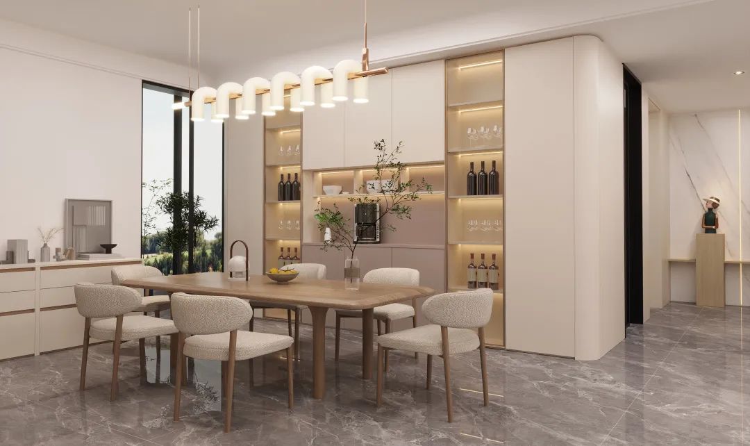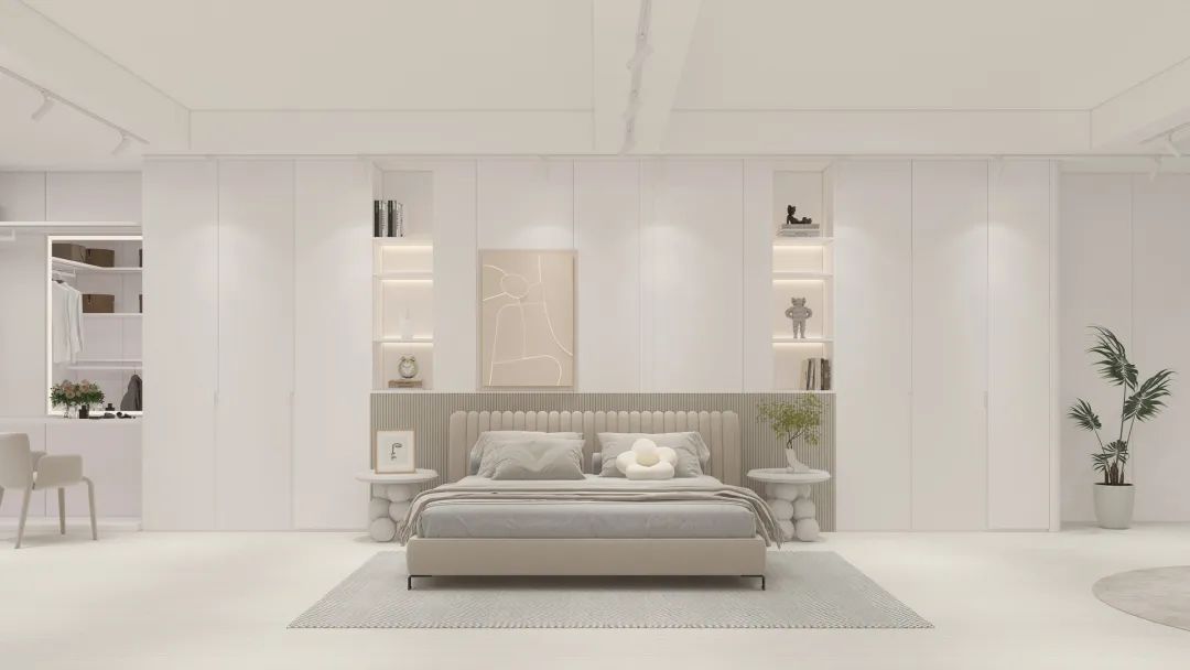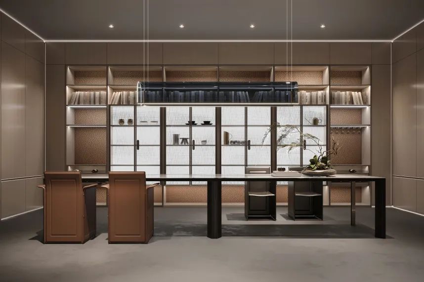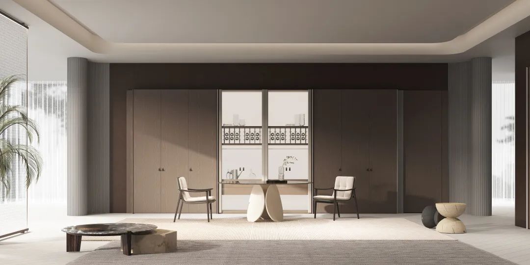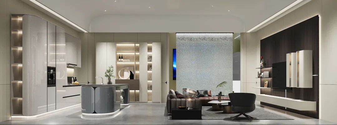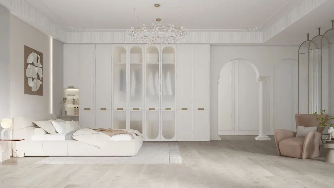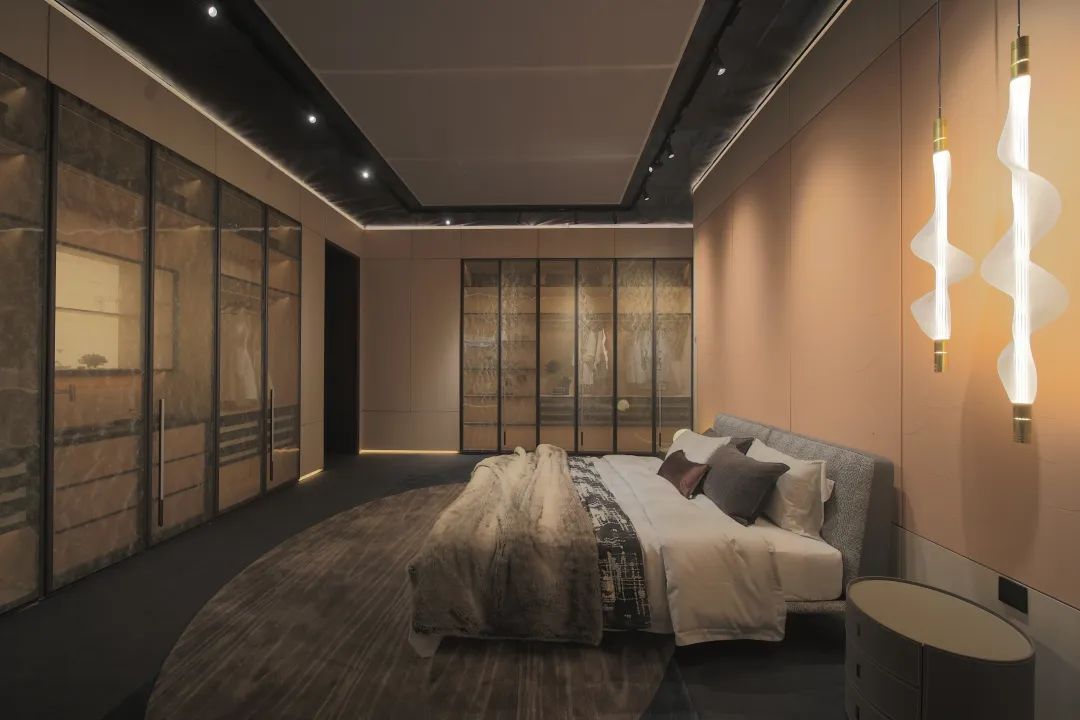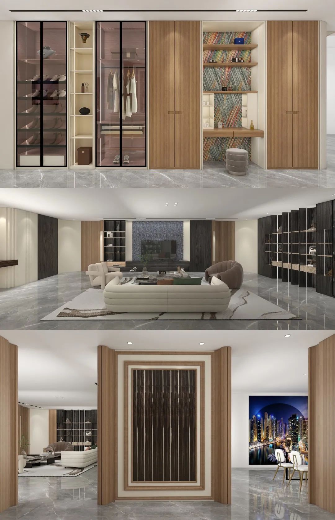 貝拉系列——曲線優(yōu)美的貝殼與圣潔月光完美融合,打造出如夢(mèng)如幻的輕法式浪漫主義??臻g整體色調(diào)柔和,奶白色、奶咖色、奶灰色互相融合,賦予空間溫柔的力量。細(xì)節(jié)上,懸空式床頭柜與衣柜形成一體,簡(jiǎn)潔大氣,視覺(jué)質(zhì)感極佳。拱形掩門(mén)結(jié)合同款玻璃門(mén)搭配嵌入式金色拉手,在收納與展示中尋找平衡,創(chuàng)造出精致的空間狀態(tài)。新貴系列——以曲線、圓弧、斜邊切線的造型,亮啞光的烤漆材質(zhì),強(qiáng)調(diào)事物本真的內(nèi)斂和克制,打造新貴的藝術(shù)空間。不同色調(diào)在空間肆意揮灑,奇妙碰撞,激活視覺(jué)層次。上下倒圓的通高門(mén),結(jié)合極具辨識(shí)度的菱格背板,通過(guò)玻璃層板燈的映射,高貴典雅的氣質(zhì)在空間得到完整呈現(xiàn)。