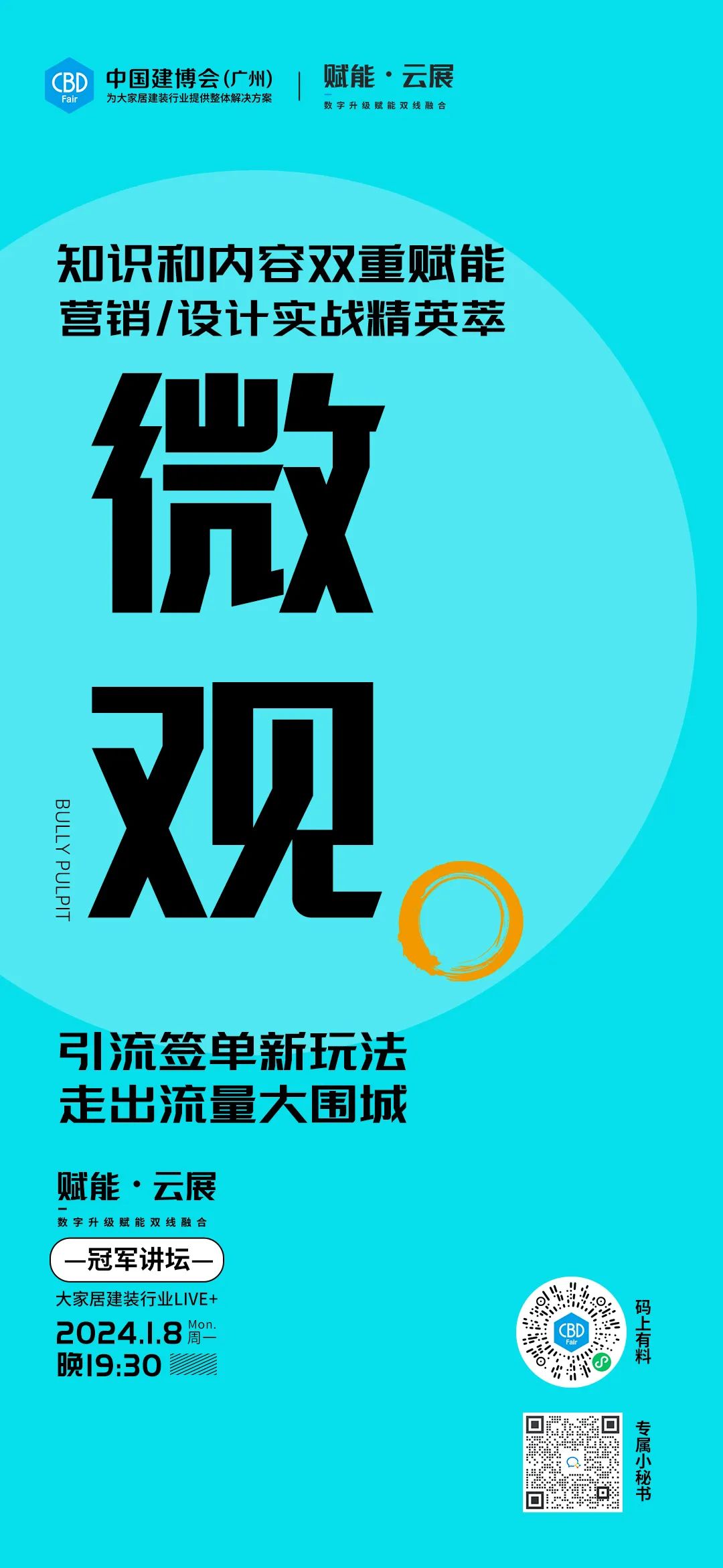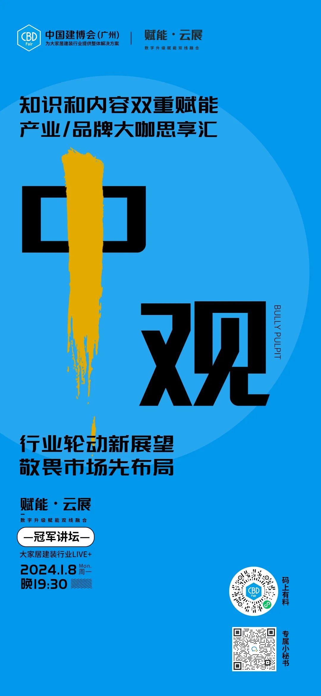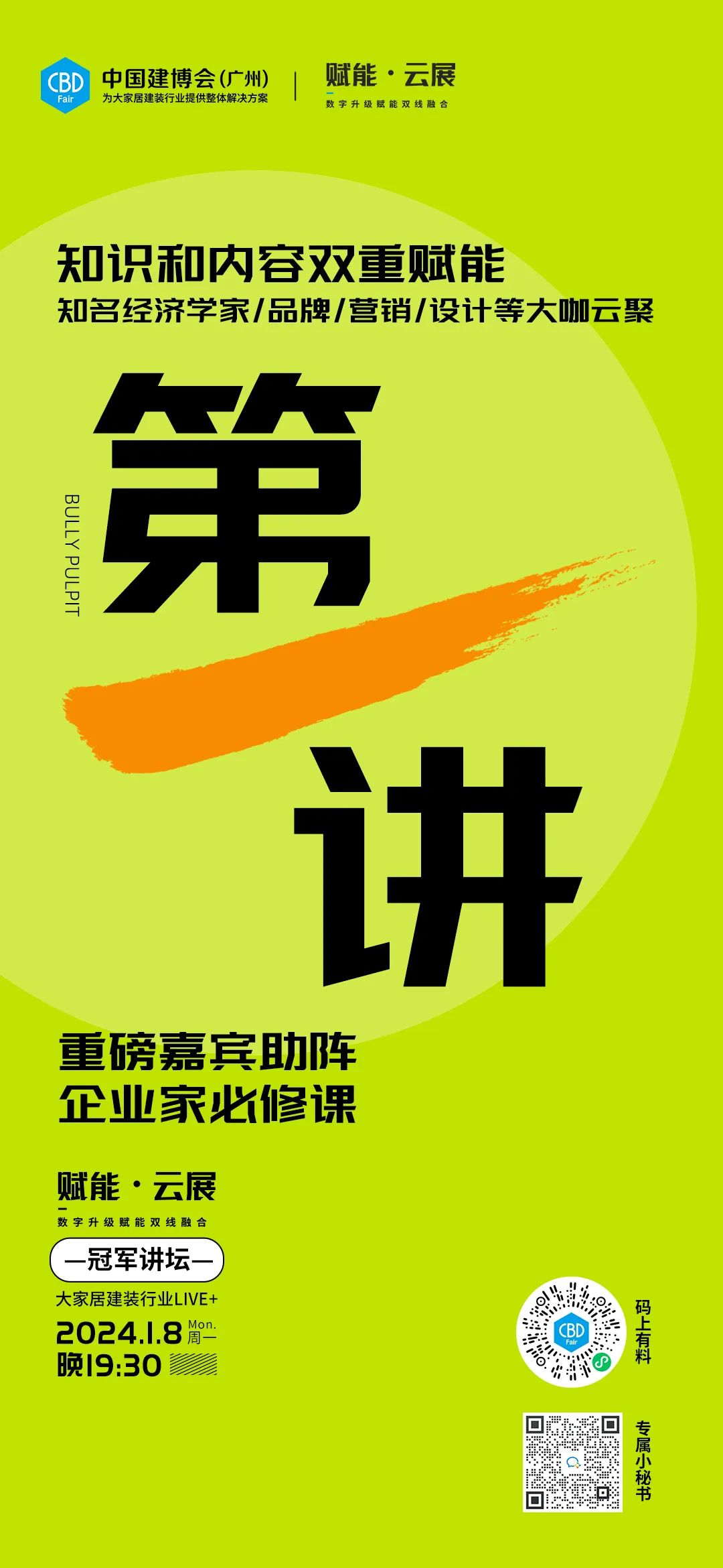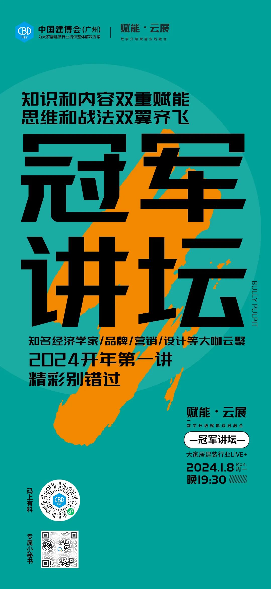 每一個行業(yè)都在尋找契機(jī),共謀“適變”之道。為推動大家居建裝行業(yè)高質(zhì)量發(fā)展,鏈動行業(yè)上下游,加快促進(jìn)消費(fèi)復(fù)蘇,中國建博會(廣州)云展平臺啟動“煥新”賦能計(jì)劃,創(chuàng)新開設(shè)“冠軍講壇”,聚焦前沿趨勢變化、大家居建裝行業(yè)熱點(diǎn)、營銷創(chuàng)新探索等方面,邀請知名經(jīng)濟(jì)學(xué)家、品牌營銷、設(shè)計(jì)、供應(yīng)鏈等大咖擔(dān)任云端演講嘉賓,分享智慧,傳遞信心,點(diǎn)亮未來。