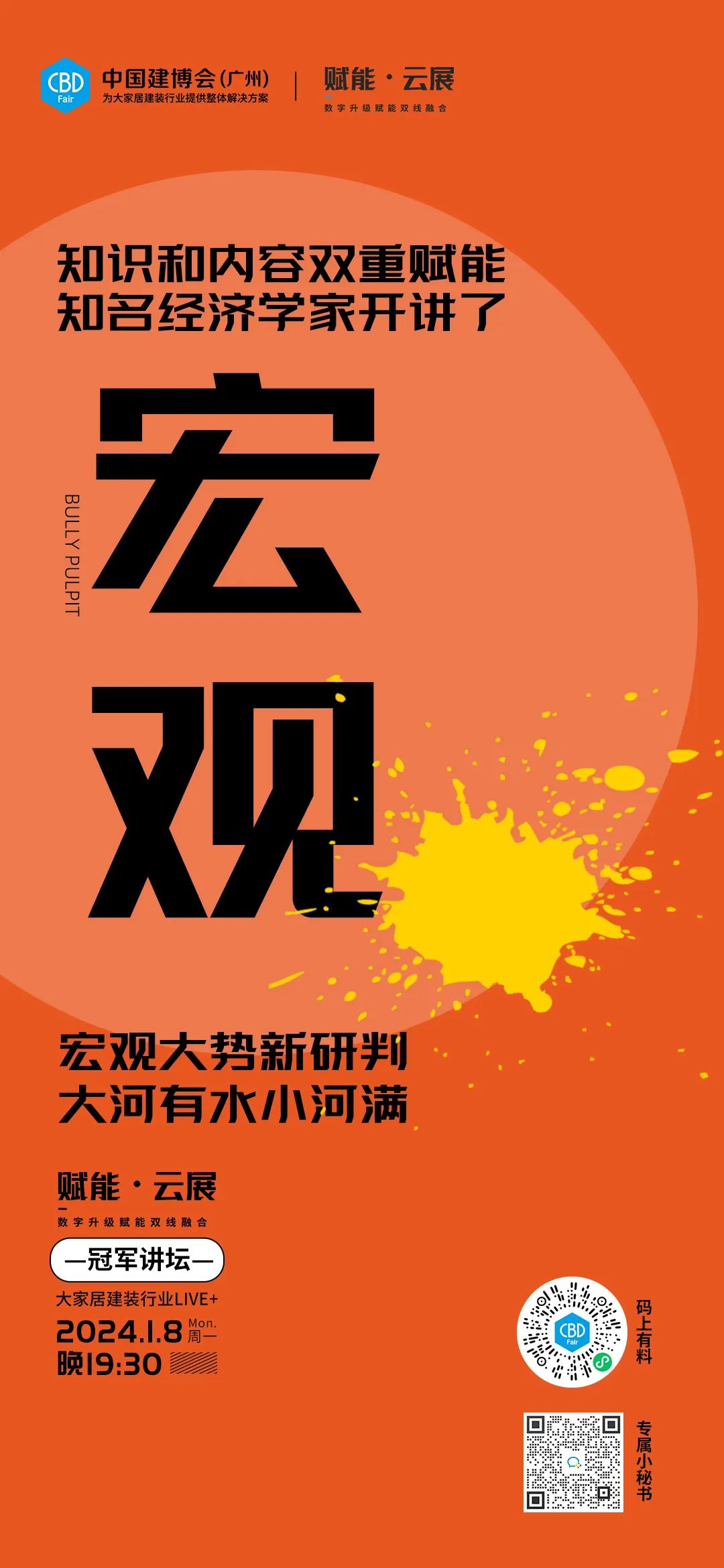 去年歲末,中央經(jīng)濟(jì)工作會議已為2024年經(jīng)濟(jì)工作定調(diào),多項(xiàng)重點(diǎn)工作任務(wù)正在密集部署展開。為把握新機(jī)遇,中國建博會(廣州)邀請知名經(jīng)濟(jì)學(xué)家、央視財經(jīng)評論員馬光遠(yuǎn)帶來“冠軍講壇”開年第一講——“2024宏觀經(jīng)濟(jì)形勢及大家居行業(yè)機(jī)遇”主題分享。馬光遠(yuǎn)老師作為在宏觀經(jīng)濟(jì)、產(chǎn)業(yè)政策、創(chuàng)新以及房地產(chǎn)等領(lǐng)域具有重要影響力的行業(yè)大拿,將會為行業(yè)呈現(xiàn)一場專業(yè)、極具價值的思想盛宴,助力大家居建裝行業(yè)開啟2024全新篇章!
