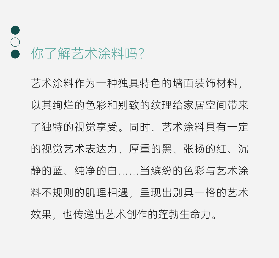 畫家列賓曾說:“色彩即思想”,藝術(shù)涂料于生活美學(xué),不止在于細(xì)節(jié)工藝,還有釋放色彩所帶來的生命力,以及設(shè)計與藝術(shù)融于生活的心靈熏陶。