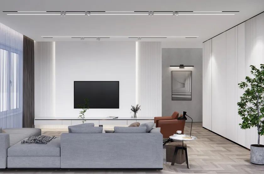 客廳電視柜用黑色仿大理石紋理板材,隱形門設(shè)計(jì)為背景,搭配膚感板材,搭色為點(diǎn)綴,襯托出溫馨家居空間,開放柜暖色燈帶搭電視柜,與格柵背景完美結(jié)合,增加了層次感與立體感。