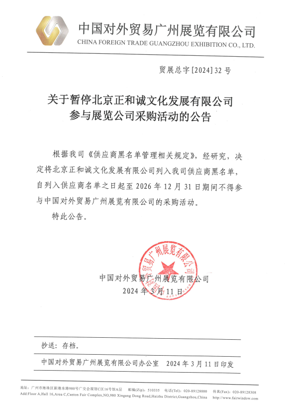 關(guān)于暫停北京正和誠(chéng)文化發(fā)展有限公司參與展覽公司采購(gòu)活動(dòng)的公告