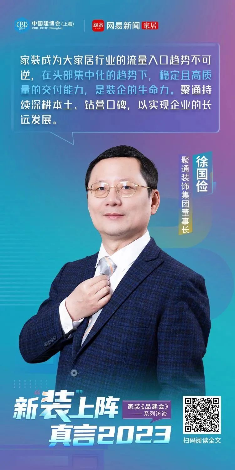2月上旬,中國(guó)建博會(huì)(上海)攜手網(wǎng)易新聞|家居聯(lián)合策劃的《家裝品建會(huì)——新“裝”上陣 真言2023》系列訪談走進(jìn)聚通裝飾集團(tuán),網(wǎng)易家居執(zhí)行主編羅會(huì)俊獨(dú)家對(duì)話聚通裝飾集團(tuán)董事長(zhǎng)、上海市室內(nèi)裝飾行業(yè)協(xié)會(huì)會(huì)長(zhǎng)徐國(guó)儉,一同探秘聚通背后的發(fā)展故事。