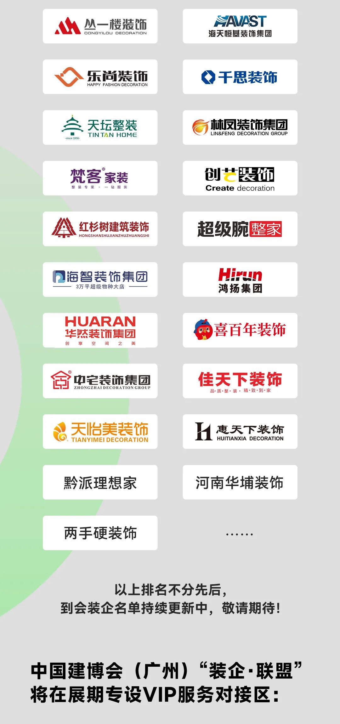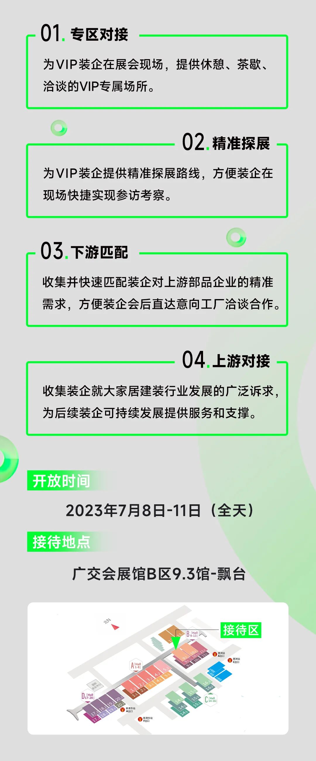 “裝企·聯(lián)盟”服務(wù)對(duì)接區(qū)與VIP入場(chǎng)快速通道,也將于7月8日-11日在展會(huì)期間呈現(xiàn),助力來(lái)自全國(guó)的龍頭裝企及從業(yè)人士與參展商實(shí)現(xiàn)精準(zhǔn)高效對(duì)接。