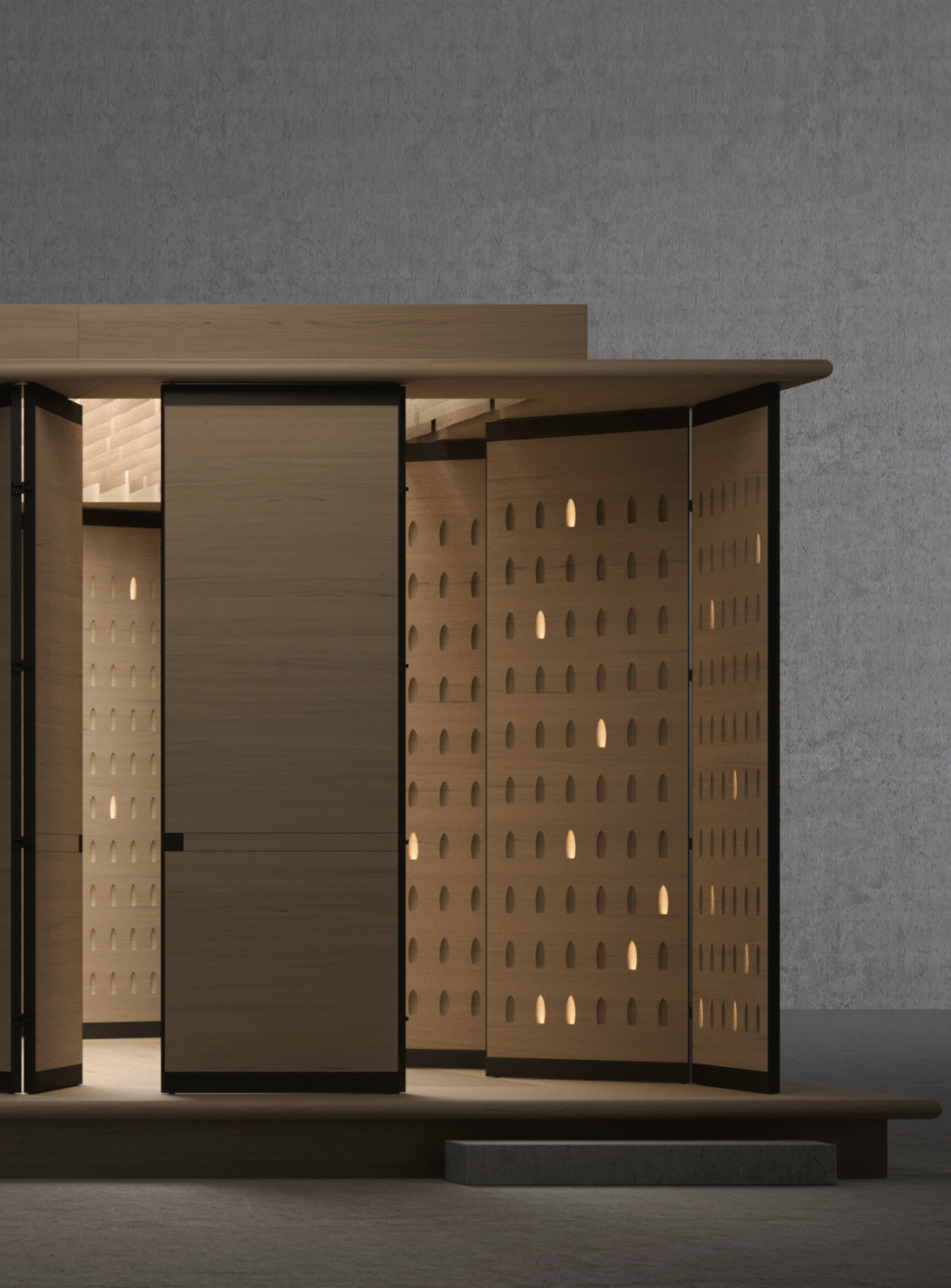 通過多扇屏風相連,蜿蜒曲折地圍出一片寂靜的空間,引領觀者逃離繁雜塵世,發(fā)現(xiàn)屬于自己的生活節(jié)奏,并避免被淹沒在時間洪流的困境中。