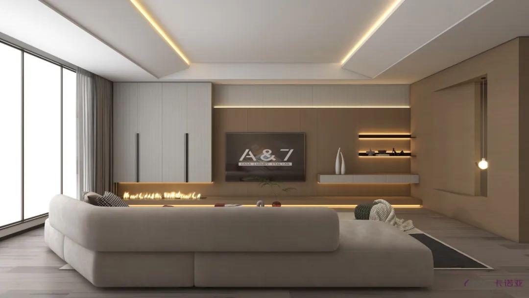 客廳電視柜用黑色仿大理石紋理板材,隱形門設(shè)計(jì)為背景,搭配膚感板材,搭色為點(diǎn)綴,襯托出溫馨家居空間,開放柜暖色燈帶搭電視柜,與格柵背景完美結(jié)合,增加了層次感與立體感。